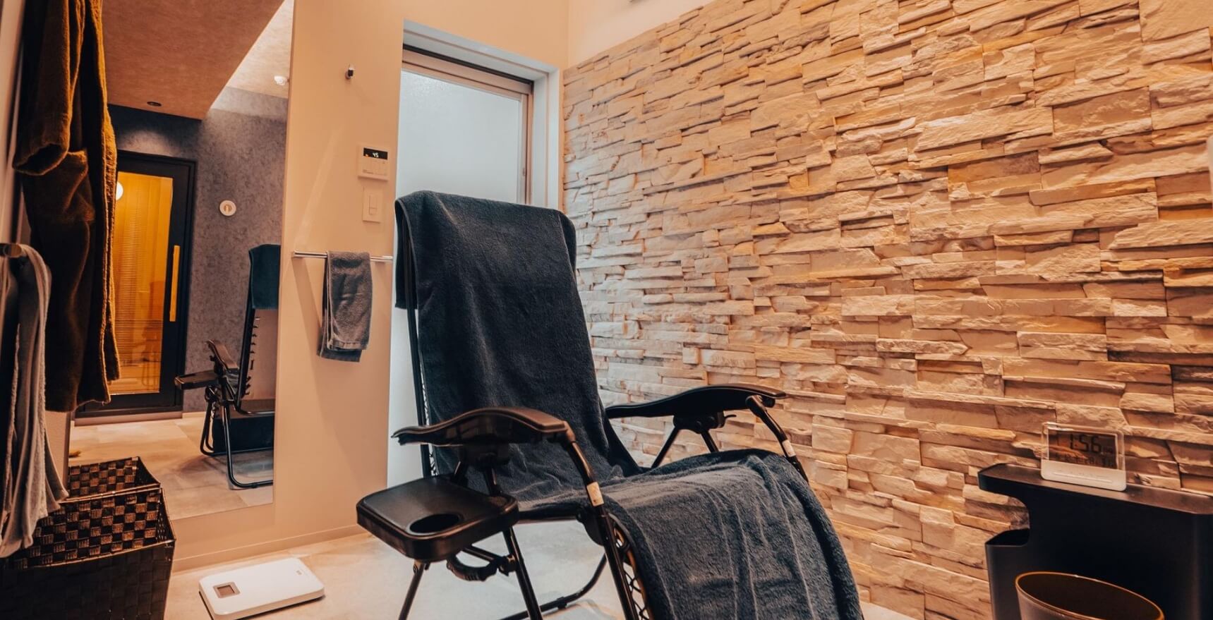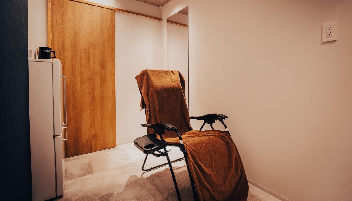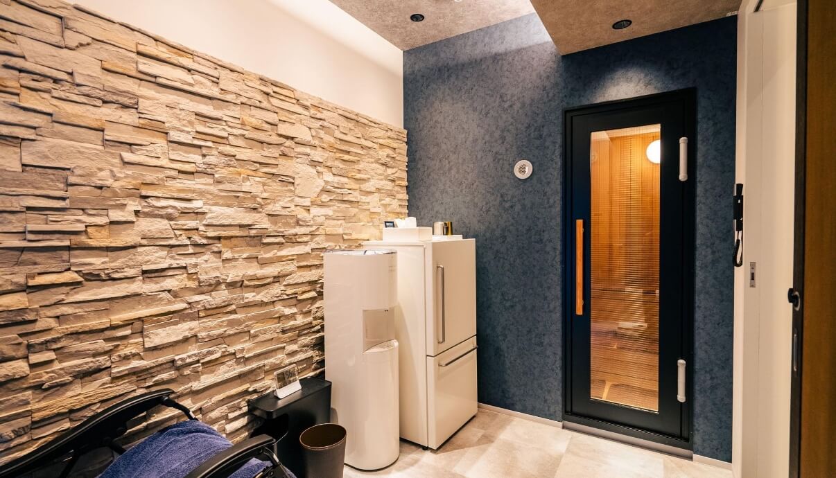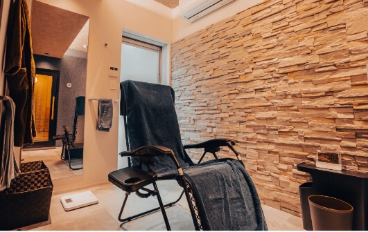 広々としたスペースで着替えができます。バスタオル・バスローブもご用意していますので、サウナ・水風呂の後はこだわりのリラックスチェアでお寛ぎください。ウォーターサーバーのお水はご自由に。冷蔵庫にはドリンクやアイスもご用意しております。