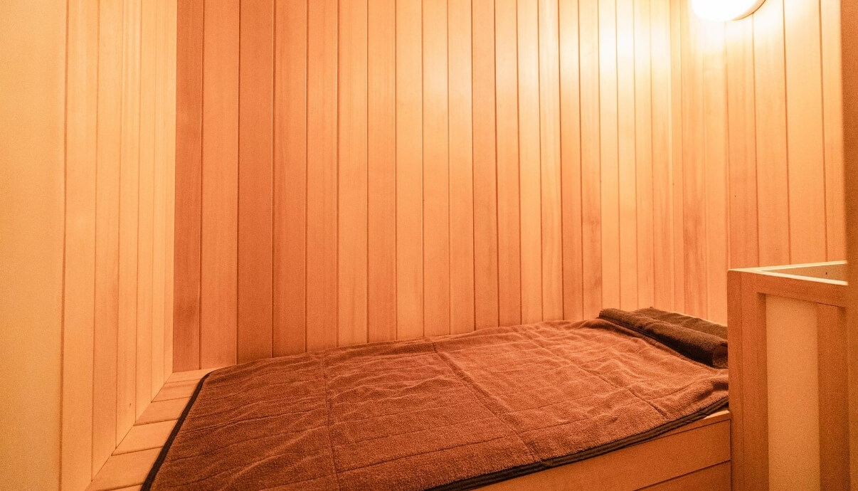 100℃前後に設定されたサウナ室にはセルフロウリュウも完備。足を伸ばしたり、横になったり、お好みのスタイルでサウナタイムを満喫していただけます。